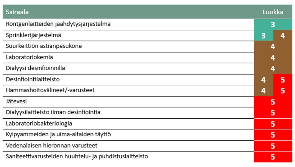 Normaalissa käytössä nesteet, jotka ovat kosketuksissa tai voivat joutua kosketuksiin juomaveden kanssa, luokitellaan viiteen luokaan taulukon mukaan.
