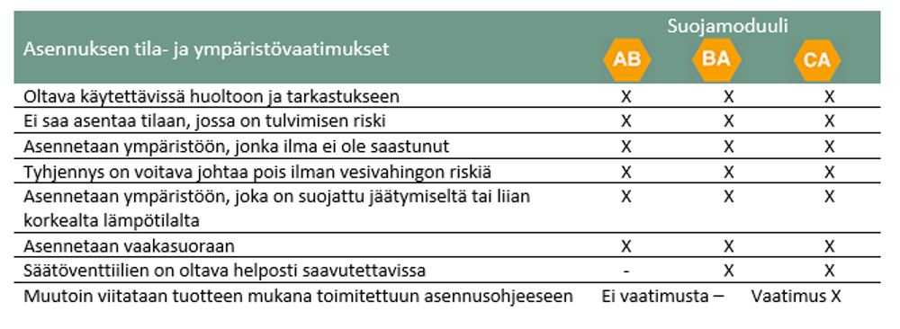 Suojamoduuli tarkoittaa standardin mukaan koko toiminnallisen takaisinvirtaussuojan kokonaislaitteistoa. Standardin SFS-EN 1717 mukaan on ehdoton vaatimus, että takaisinvirtaussuoja asennetaan suojamoduulina. Älä käytä olemassa olevia venttiilejä johtojärjestelmän läheisyydessä osana suojamoduulia, koska se heikentää hallintaa ja huoltoa.