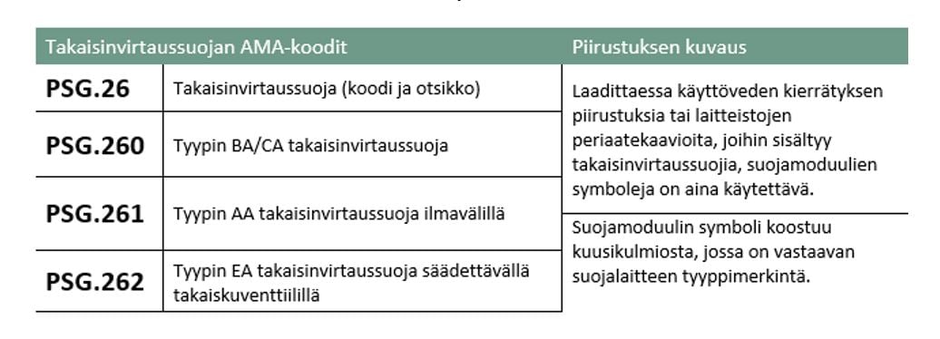 Taulukossa esitetään takaisinvirtaussuojan AMA-koodit: