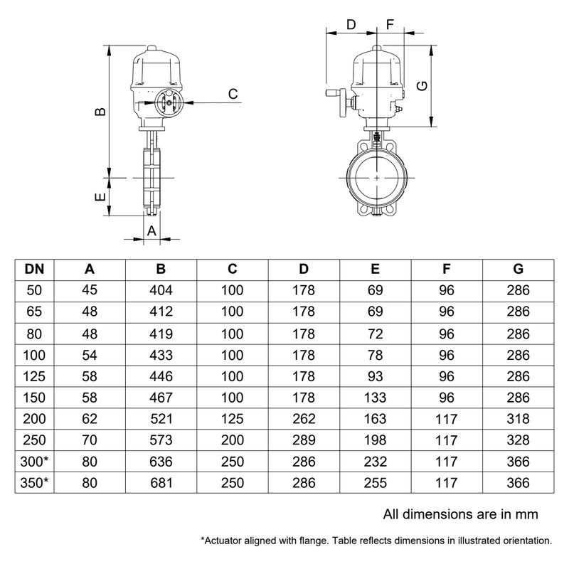 Dreiespjeldventil AT2313B...AQ, med hus av seigjern og fastvulkanisert tetning av EPDM samt spjeld i Duplex. Elektrisk on/off aktuator.
