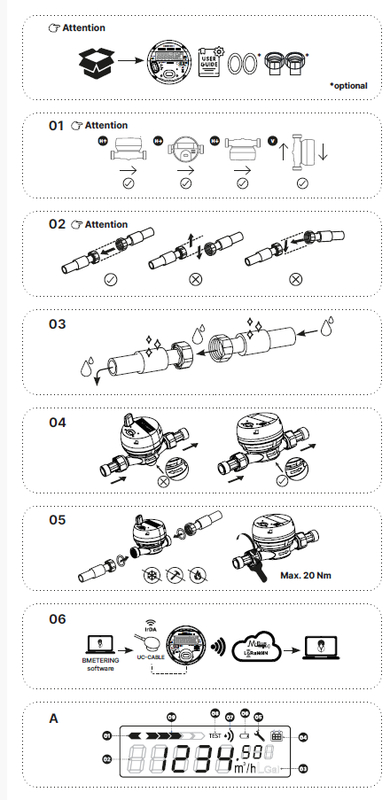 • Enheten er forhåndskonfigurert og klar til å sende data via wM-Bus og/eller LoRaWAN etter at ±5 liter vann har passert gjennom måleren. Enhetens innstillinger kan vises/endres via Android-appen **Bmetering NFC Config** eller via **B Metering Software** (6). For mer informasjon, se salgsordren samt wM-Bus- eller LoRaWAN-dokumentasjonen som er tilgjengelig fra kundeservice.