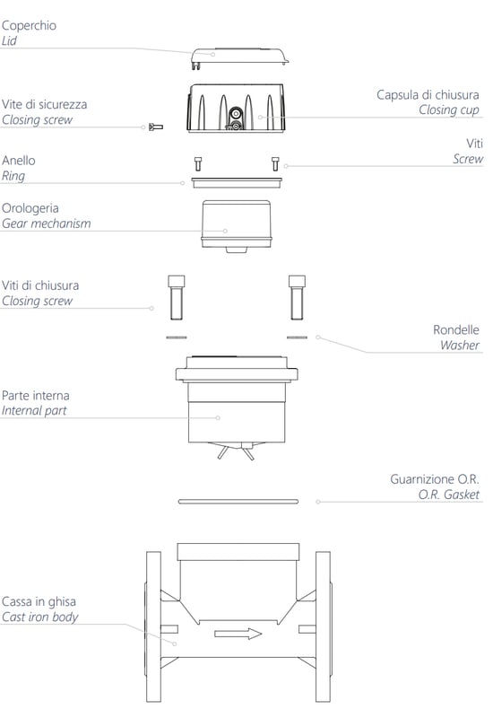 VÊr oppmerksom pÄ strÞmningsretningen. Installer mÄleren slik at vannstrÞmmen fÞlger retningen angitt av pilen som er preget pÄ mÄlerhuset.