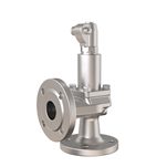 Sikkerhetsventil med høytløftende karakteristikk. Flenset tilkobling. Av rustfritt syrefast stål. Myktettende disk.