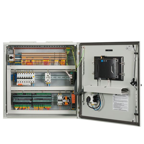 Plåtskåp med eluttag och personskyddsbrytare. Upp till 10 st ställdon kan styras med 0-10V signaler. Skåpet är förberett för matning av 5 st laster på enfas. Kan fås med operatörspanel, 10” eller 15” Android skärm.