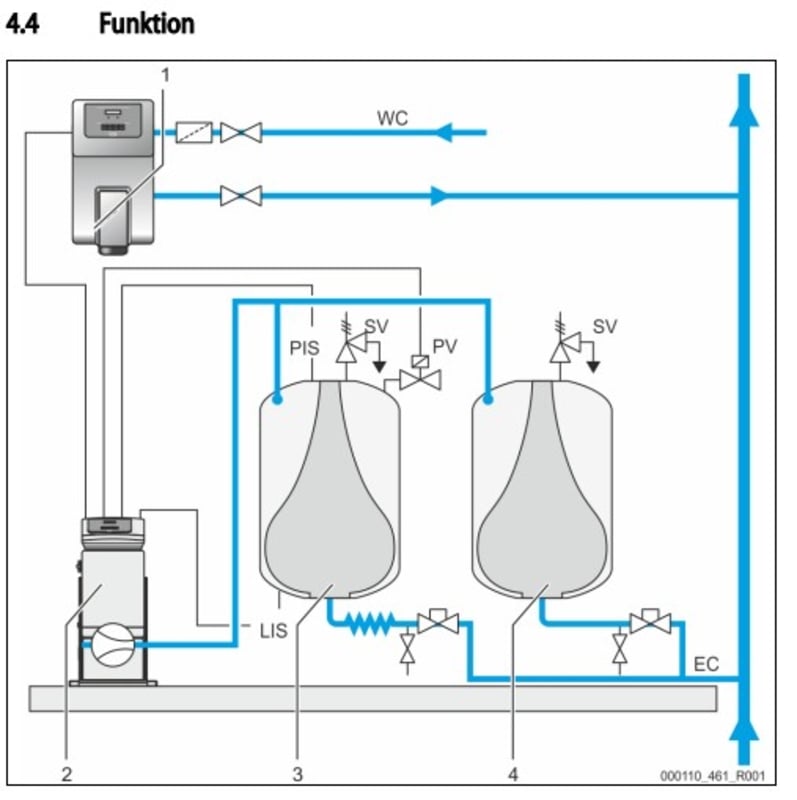 Direkt på kärlet finns styrenheten som konstant övervakar och reglerar för att hålla anläggningens drifttryck så jämnt som möjligt. Trycket tillåts sjunka ned till max 0,1 bar under inställt drifttryck, innan kompressorn startar tryckhöjningen upp till valt drifttryck och stannar. En tryckstegring sker i anläggningen när temperaturen stiger på grund av fluidens volymökning och som tas upp av expansionskärlet. Vid max 0,1 bars tryckhöjning öppnar magnetventilen för att åter sänka trycket till inställt drifttryck.