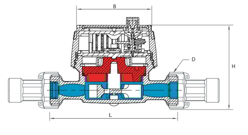 VattenmÀtaren Àr av torrlöpande enstrÄlig vinghjulstyp. Vinghjulet Àr den enda rörliga delen i vattnet och nedvÀxling sker helt torrlöpande med magnetkoppling.